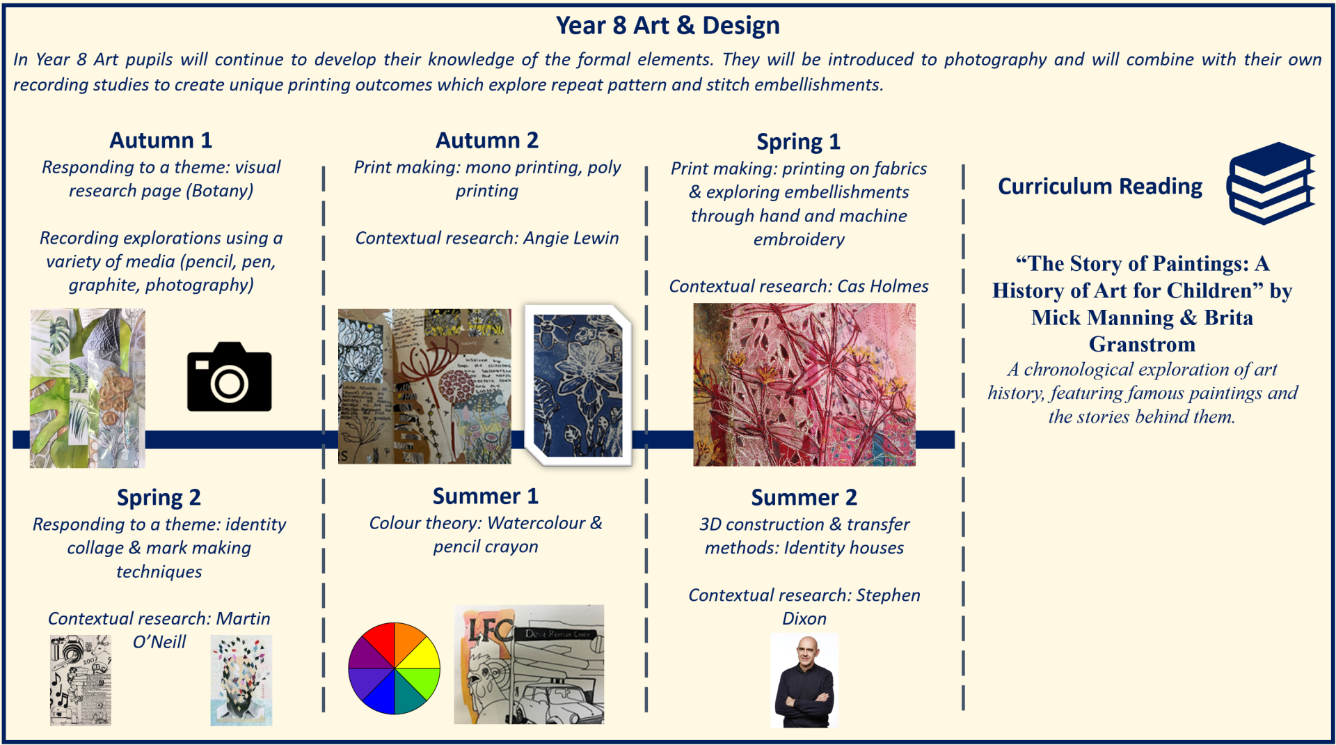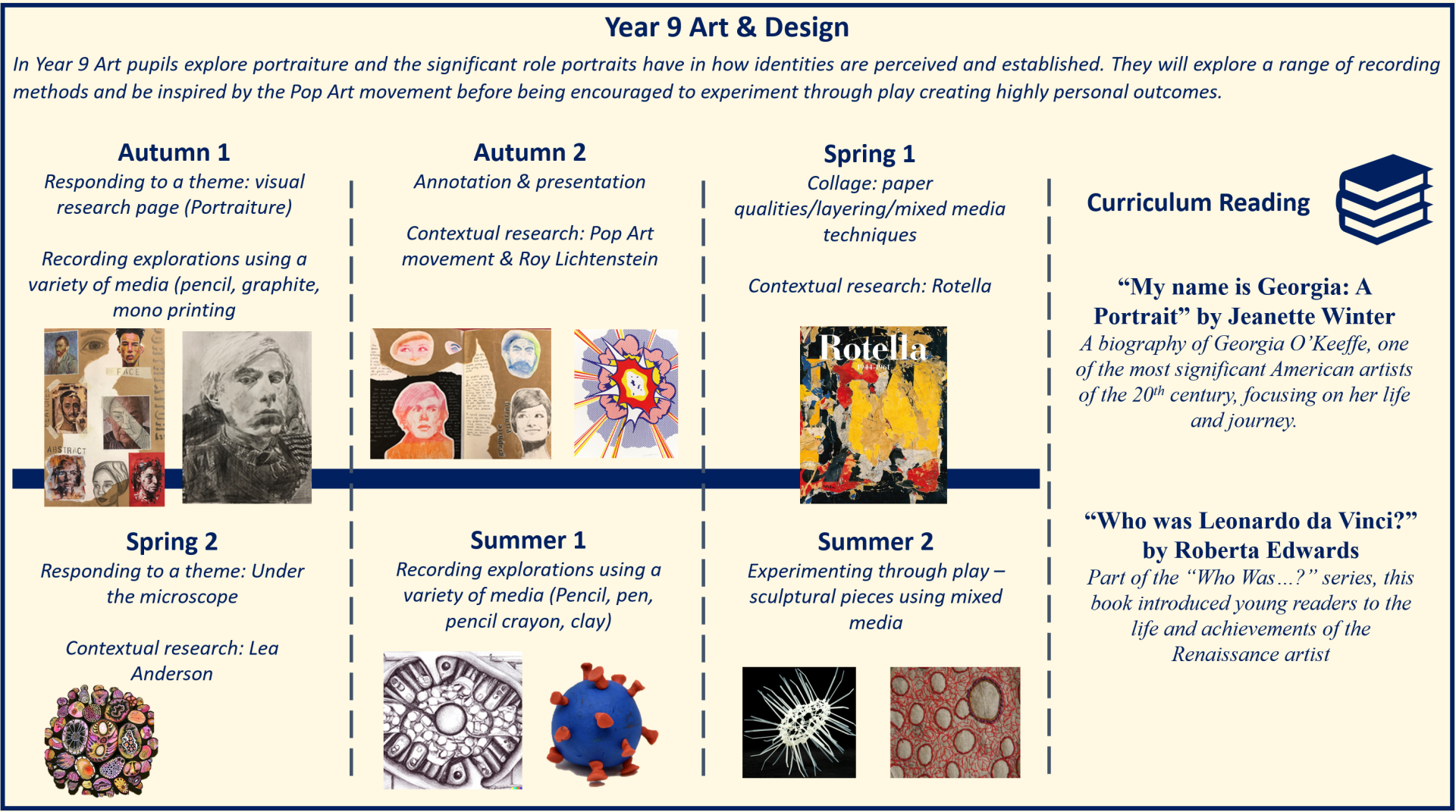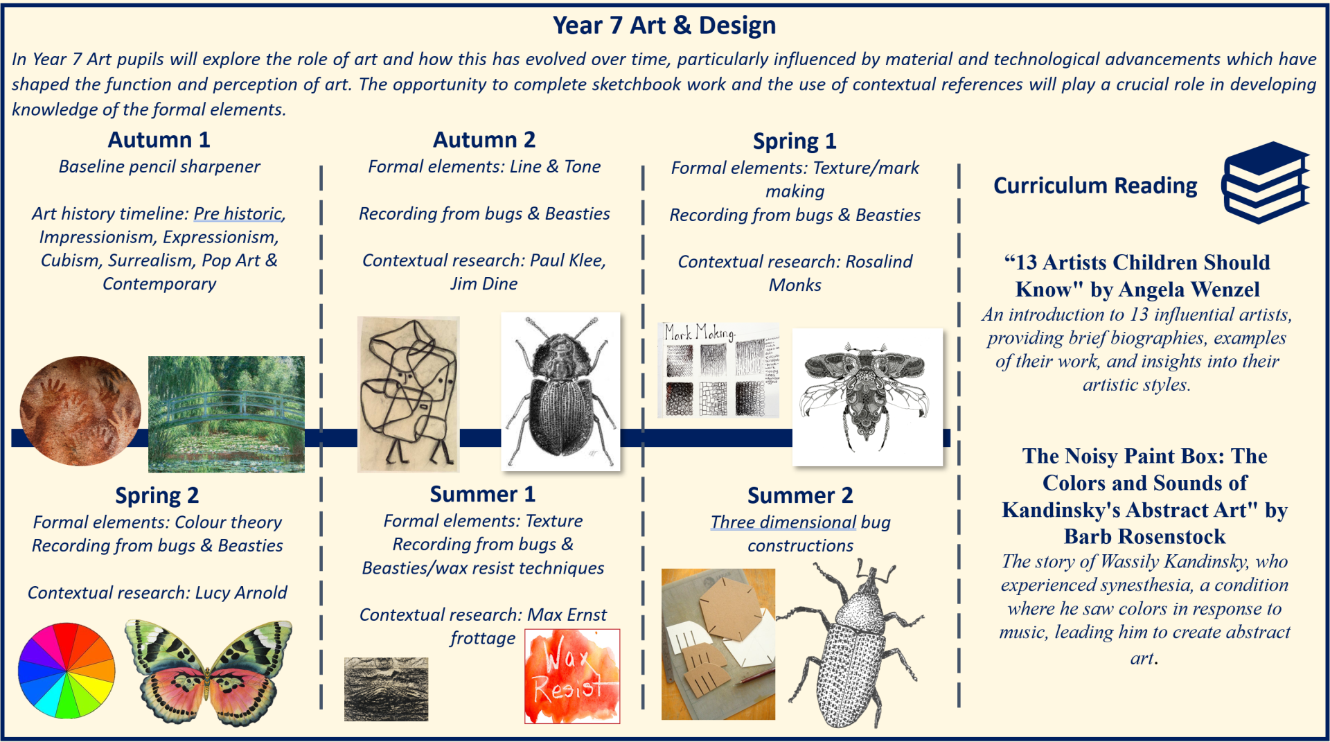 Art is taught by the same subject specialist throughout the year and pupils will experience & explore a range of materials/techniques/skills and seek inspiration from artists & designers.